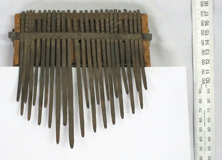 Rectangular bar and top ends of notes decorated. Backplate. Rattle plate with 26 small snail shells held with home-made string